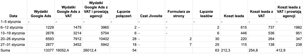 - Zbadaliśmy dane z przeszłości: - Zaczęliśmy w przejrzysty sposób obliczać cenę leada i klienta. Tabela wyników (na zdjęciu powyżej) nie została stworzona i dopiero po rozpoczęciu współpracy z agencją marketingową Spilno klient uzyskał przejrzysty wynik pracy poprzedniej agencji.